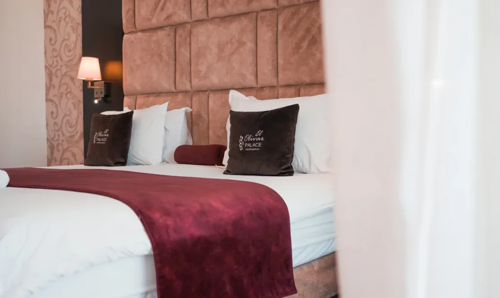 Découvrez nos chambres & Suites à l’El Olivar Palace, conçues pour votre confort et sérénité. Que vous soyez en famille (Chambre famille, Chambre triple supérieure) ou en quête d’espace raffiné (Suites junior de 72 m² avec terrasse/balcon), nos hébergements allient modernité et élégance pour une expérience inoubliable à Marrakech.